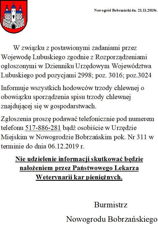 • niezwłocznie przekazała tę informację do służb weterynaryjnych (Powiatowego Lekarza Weterynarii) lub Urzędu Gminy w Nowogrodzie Bobrzańskim, Policji lub Straży Miejskiej
