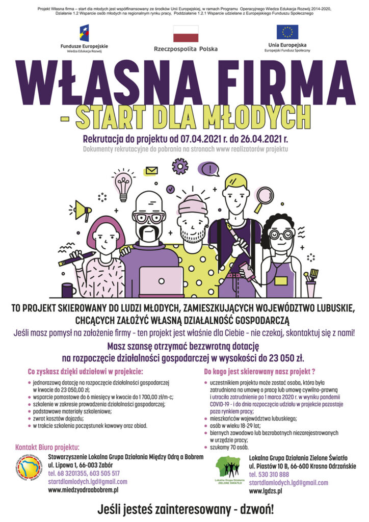 Stowarzyszenie Lokalna Grupa Działania Między Odrą a Bobrem z siedzibą w Zaborze, informuje, iż rekrutacja uczestników do projektu pt. „Własna firma – start dla młodych” – realizowany w ramach konkursu: POWR.01.02.01-IP.25-08-K04/20 będzie trwała w okresie