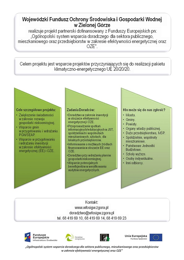 W Wojewódzkim Funduszu Ochrony Środowiska i Gospodarki Wodnej w Zielonej Górze, w ramach ogólnopolskiego projektu pn. „Ogólnopolskim systemie wsparcia doradczego dla sektora publicznego, mieszkaniowego oraz przedsiębiorstw w zakresie efektywności energetycznej oraz OZE” działa Zespół Doradców Energetycznych.