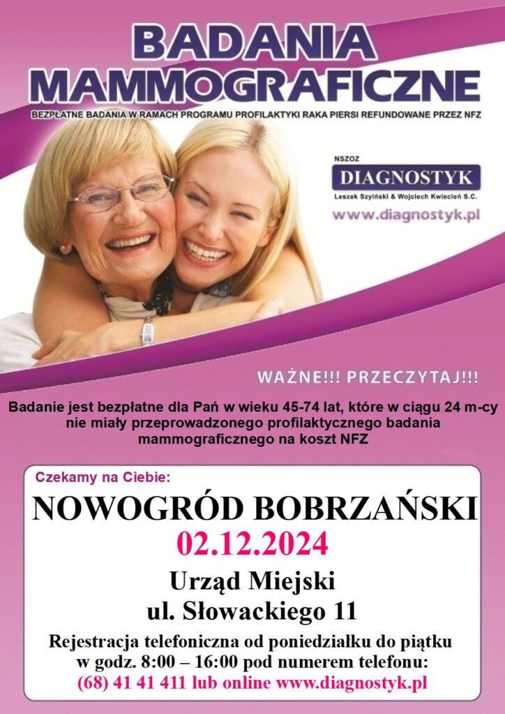 Stała kontrola piersi daje ogromną szansę wykrycia wczesnych zmian i zastosowania leczenia, dlatego serdecznie zapraszamy zapisane Panie do mammobusu w Nowogrodzie Bobrzańskim przy Urzędzie Miasta ul. Słowackiego dnia 8.11.2024 r.
