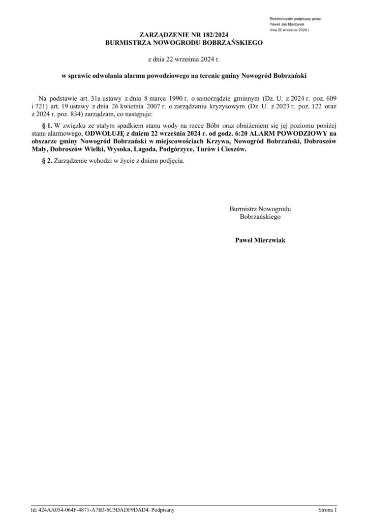 ZARZĄDZENIE NR 182/2024 – link do pobrania z BIP