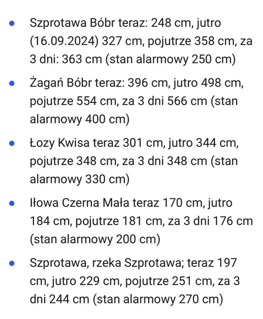 O godz. 12:00 Burmistrz Nowogrodu Bobrz. zwołał Gminny Zespół Zarządzania Kryzysowego (udział wzięli przedstawiciele Wód Polskich, Starostwa Powiatowego, OSP, OPS, Urzędu Miejskiego, MZGKiM). Prognozuje się, że duża fala wody dotrze do naszej gminy za kilkadziesiąt godzin (jednym z czynników, który ma wpływ co będzie u nas i kiedy jest sytuacja na zaporze w Pilchowicach). Podjęto decyzję o prewencyjnych działaniach (ustawienie worków na wałach w miejscach najbardziej narażonych na przekroczenia, w tym Dobroszów Mały, Nowogród Bobrz., Cieszów, Krzywa, Podgórzyce). Przez PGE na bieżąco prowadzone są działania mające na celu zwiększenie zrzutów wody na tamie w Krzywańcu, aby przygotować, zminimalizować skutki przejścia przewidywanej większej fali . Sytuacja zmienia się dynamicznie dlatego bardzo prosimy śledzić informacje na bieżąco. Poniżej stan rzeki Bóbr.