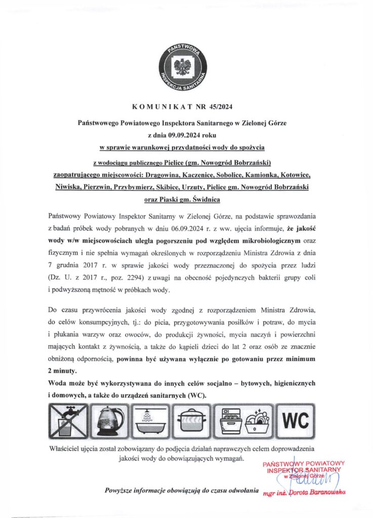 Państwowego Powiatowego Inspektora Sanitarnego w Zielonej Górze z dnia 09.09.2024 roku w sprawie warunkowej przydatności wody do spożycia z wodociągu publicznego Pielice (gm. Nowogród Bobrzański) zaopatrującego miejscowości: Drągowina, Kaczenice, Sobolice, Kamionka, Kotowice, Niw iska, Pierzwin, Przybymierz, Skibice, U rzuty, Pielice gm, Now ogród Bobrzański oraz Piaski gm. Świdnica