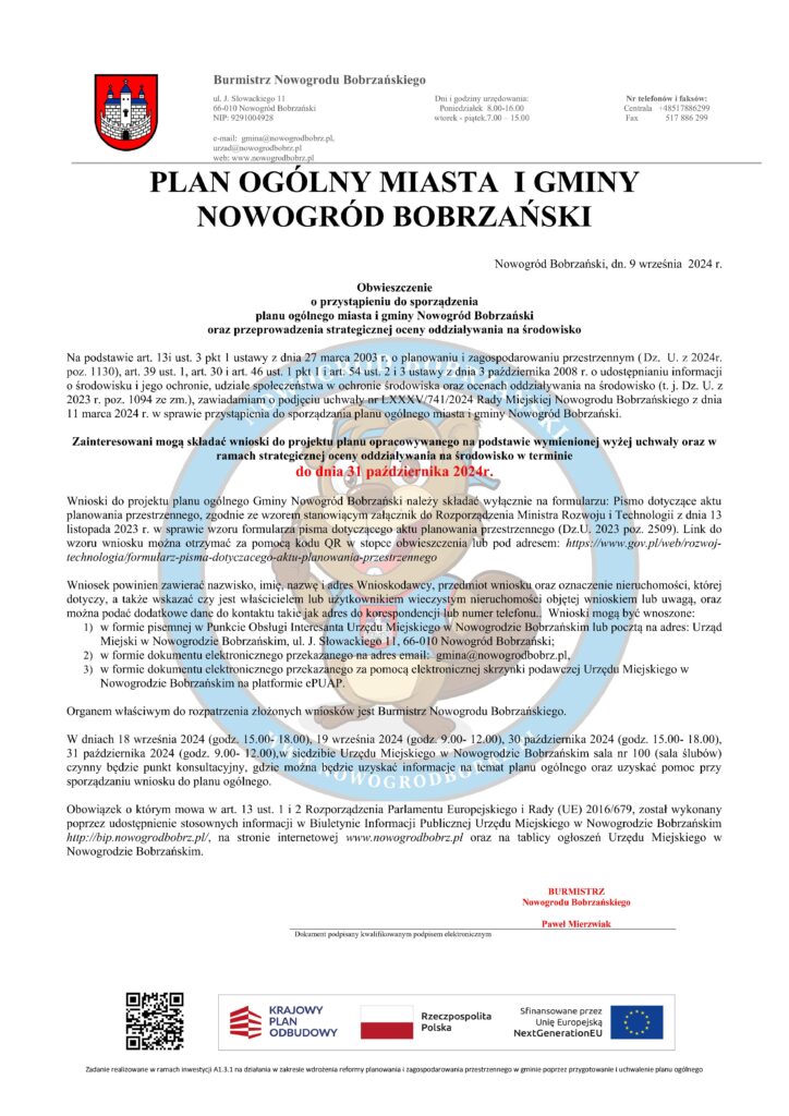 Obwieszczenie o przystąpieniu do sporządzenia planu ogólnego miasta i gminy Nowogród Bobrzański oraz przeprowadzenia strategicznej oceny oddziaływania na środowisko