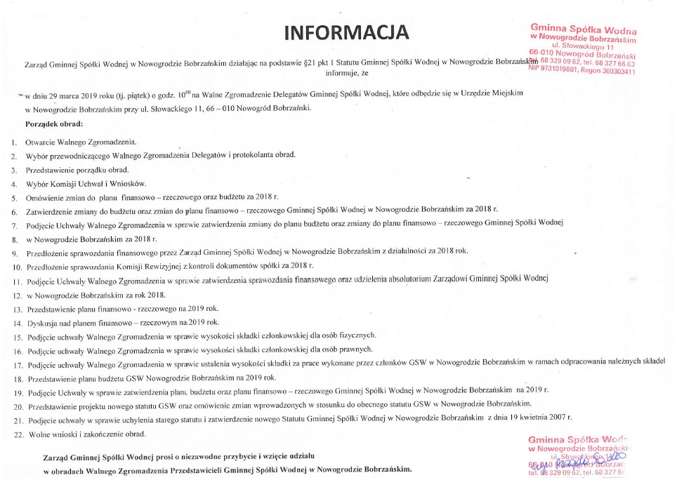 Zarząd Gminnej Spółki Wodnej w Nowogrodzie Bobrzańskim informuje, że w dniu 29 marca 2019 roku (tj. piątek) w Urzędzie Miejskim w Nowogrodzie Bobrzańskim ul. Słowackiego 11, 66-010 Nowogród Bobrzański o godzinie 10:00 obędzie się Walne Zgromadzenie Delegatów Gminnej Spółki Wodnej