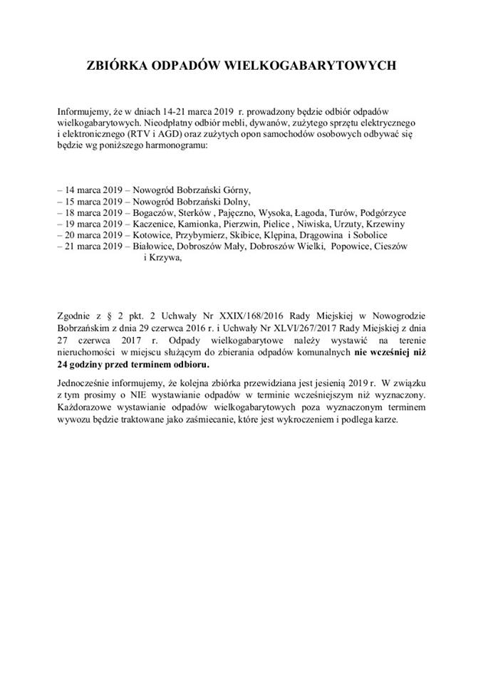 Informujemy, że w dniach 14-21 marca 2019r. prowadzony będzie odbiór odpadów wielkogabarytowych. Odpady prosimy wystawić nie wcześniej niż 24 godziny przed terminem odbioru.