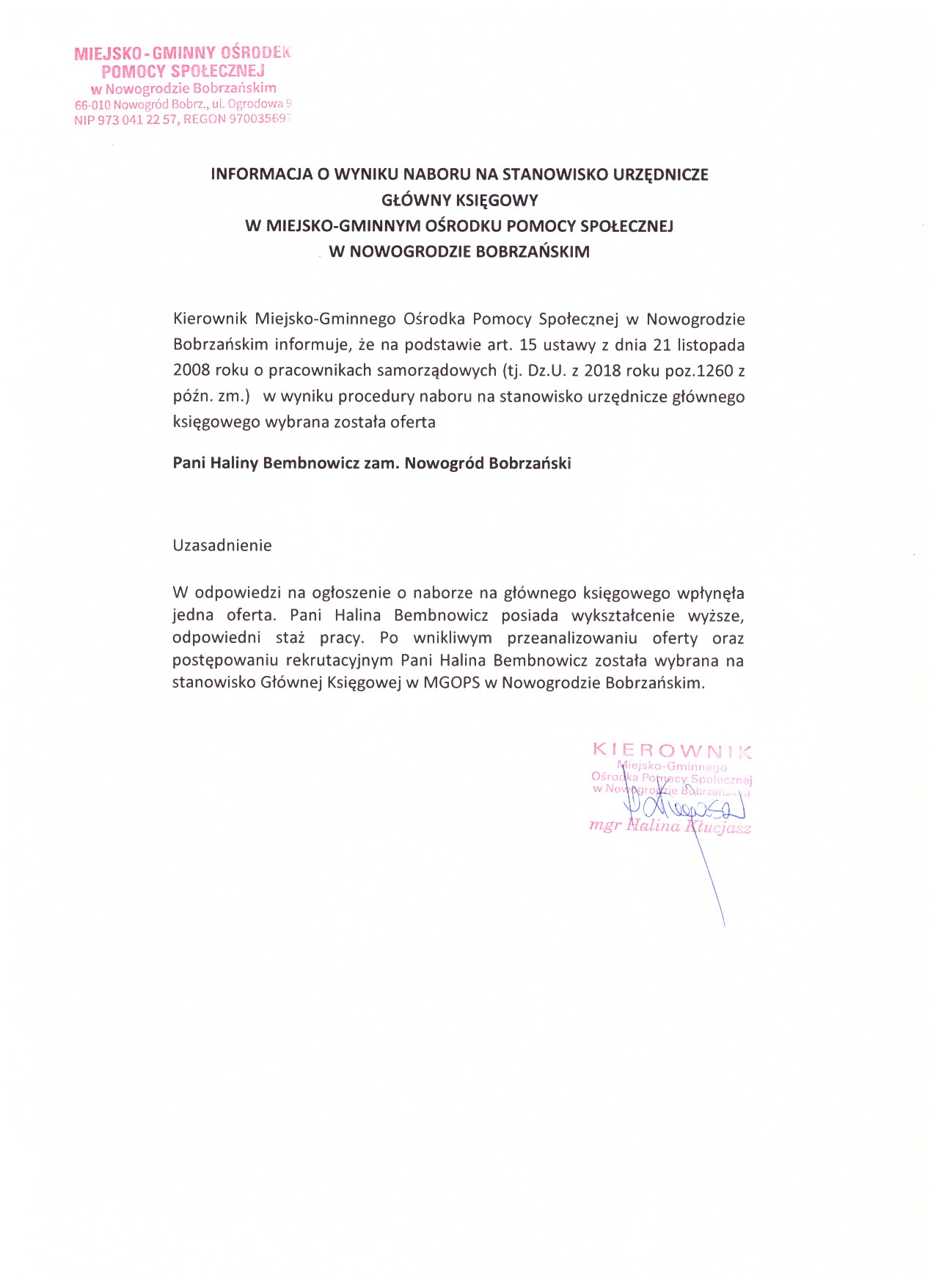 Miejsko-Gminny Ośrodek Pomocy Społecznej Nowogród Bobrzański ul.Ogrodowa 9 w Nowogrodzie Bobrzańskim informuje o wynikach i unieważnieniach naborów na stanowiska urzędnicze: