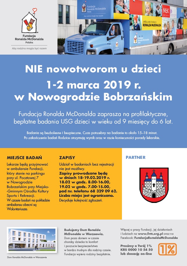 1-2 marca 2019 r. w Nowogrodzie Bobrzańskim Fundacja Ronalda McDonalda zaprasza na profilaktyczne, bezpłatne badania USG dzieci w wieku od 9 miesięcy do 6 lat.