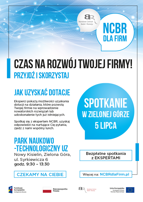 Narodowe Centrum Badań i Rozwoju zaprasza firmy z Zielonej Góry i okolic na BEZPŁATNE spotkanie dla przedsiębiorców, podczas którego dowiedzą się jak uzyskać DOTACJĘ NA ROZWÓJ FIRMY!