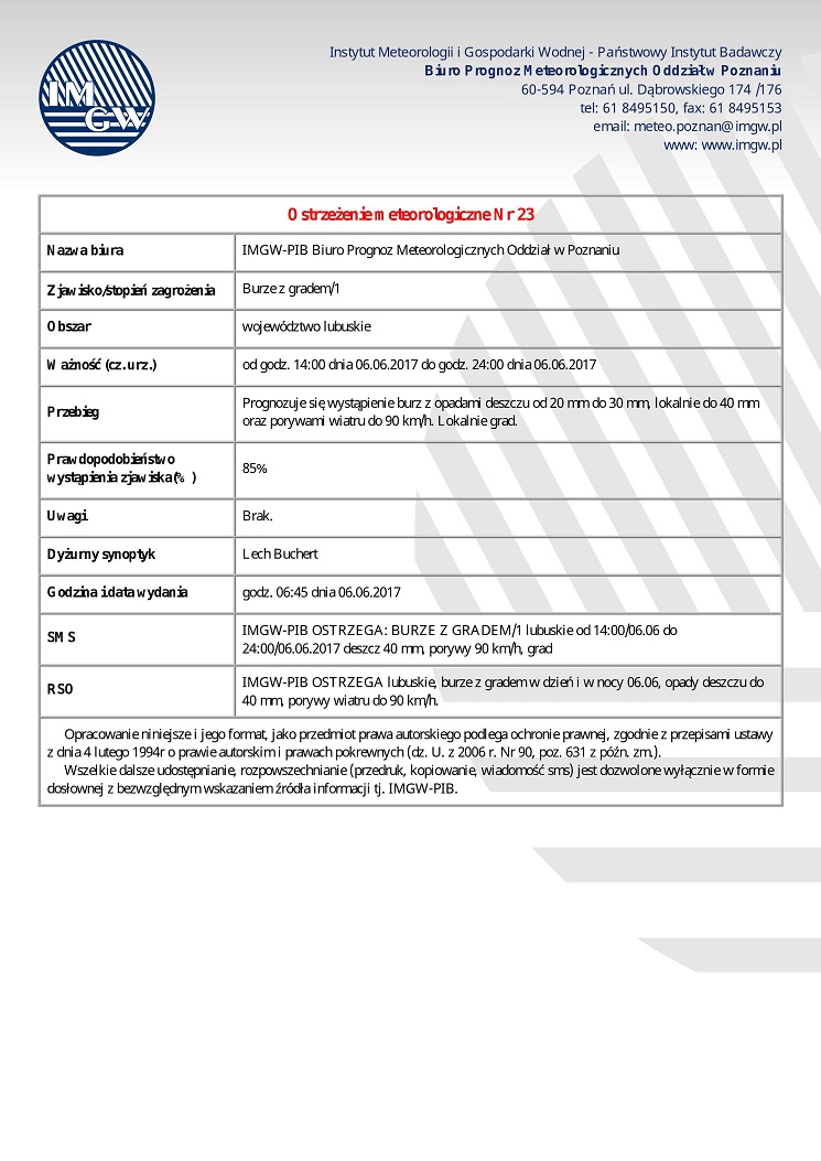 Instytut Meteorologi i Gospodarki Wodnej oddział w Poznaniu ostrzega o możliwości wystąpienia w dniu 06.06.2017r od godz. 14:00-24:00 burz z gradem, opadów deszczu do 40 mm i wiatru w porywach do 90 km/h.