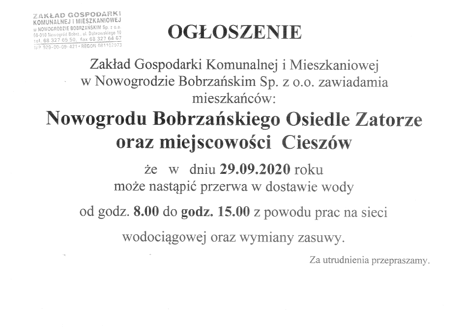 że w dniu 29-09-2020 roku może nastąpić przerwa w dostawie wody