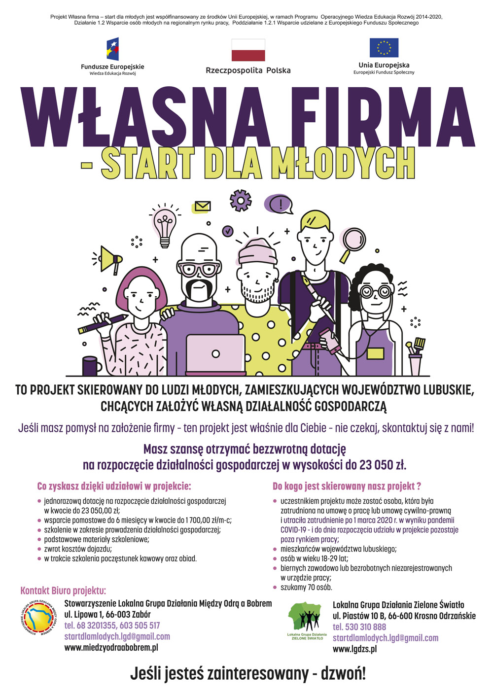 Stowarzyszenie Lokalna Grupa Działania Między Odrą a Bobrem wspólnie z LGD Zielone Światło wkrótce rozpocznie rekrutację do projektu pt. Własna firma- start dla młodych – w ramach Osi Priorytetowej: I Rynek pracy otwarty dla wszystkich. Działanie 1.2 Wsparcie dla osób młodych na regionalnym rynku pracy, poddziałanie: 1.2.1 Wsparcie udzielane z Europejskiego Funduszu Społecznego