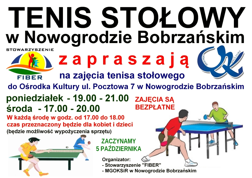 Stowarzyszenie „FIBER” oraz Miejsko-Gminny Ośrodek Kultury Sportu i Rekreacji zapraszają od dnia 05-10-2015 r. na zajęcia tenisa stołowego