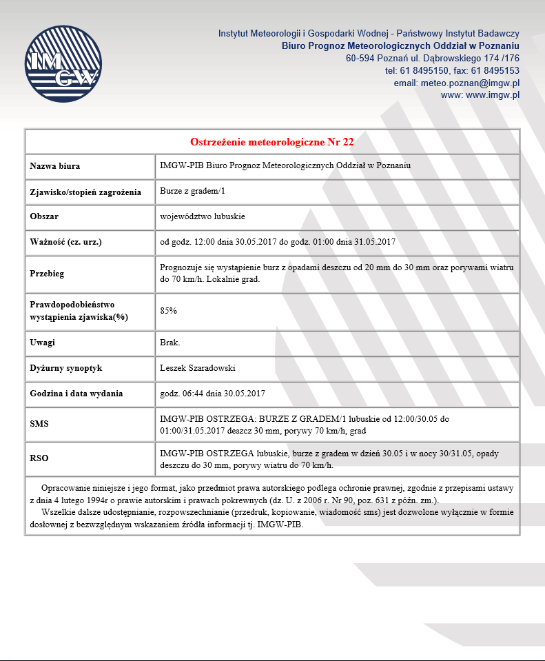 Instytut Meteorologi i Gospodarki Wodnej oddział w Poznaniu ostrzega o możliwości wystąpienia w dniu 30.05-1-05.2017r od godz. 12:00-01:00 burz z gradem, opadów deszczu do 30 mm i wiatru w porywach do 70 km/h.